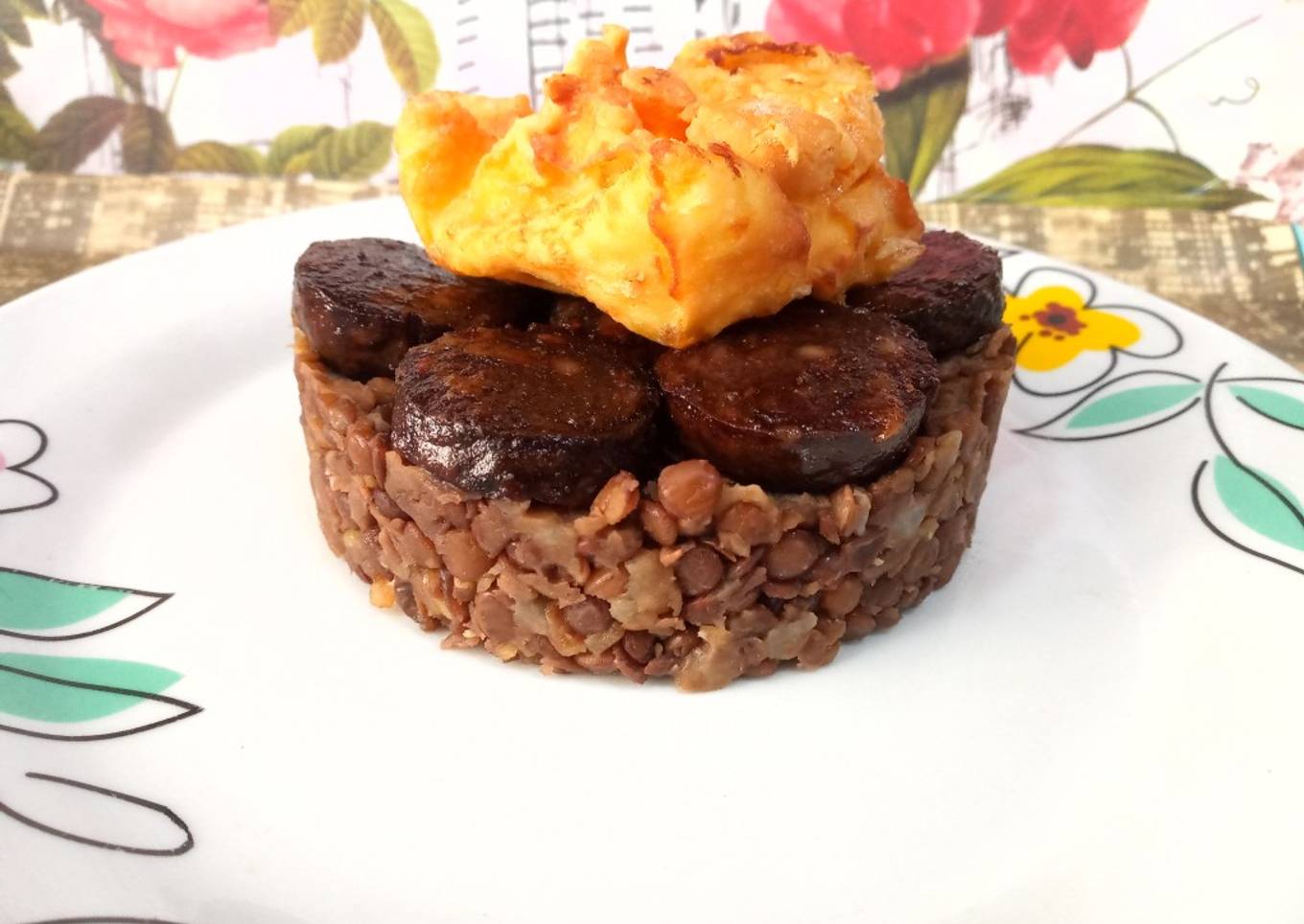 - Para presentar el plato poner las lentejas en la base, por encima unas rodajas de la botifarra y colocar en el centro el huevo.