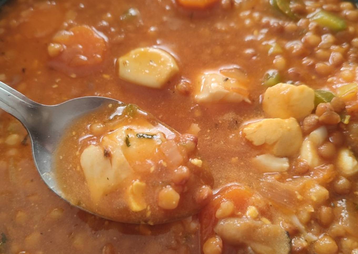 - Pasado el tiempo removemos y echamos los huevos, las lentejas, el pimentón y la cayena, mezclamos.