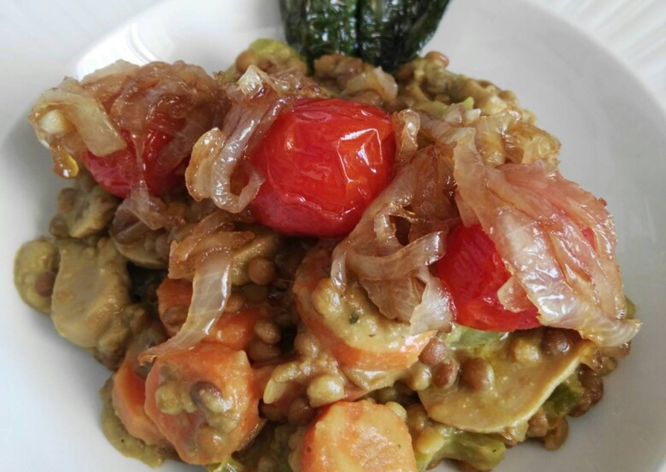 - Emplatamos las lentejas, y encima los tomates cherry fritos. Acompañamos con los pimientos y la cebolla caramelizada