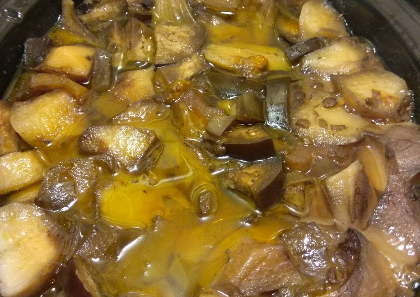- Lavar y cortar en cuadraditos la berenjena (excepto las patatas) y ponerla en la olla.
