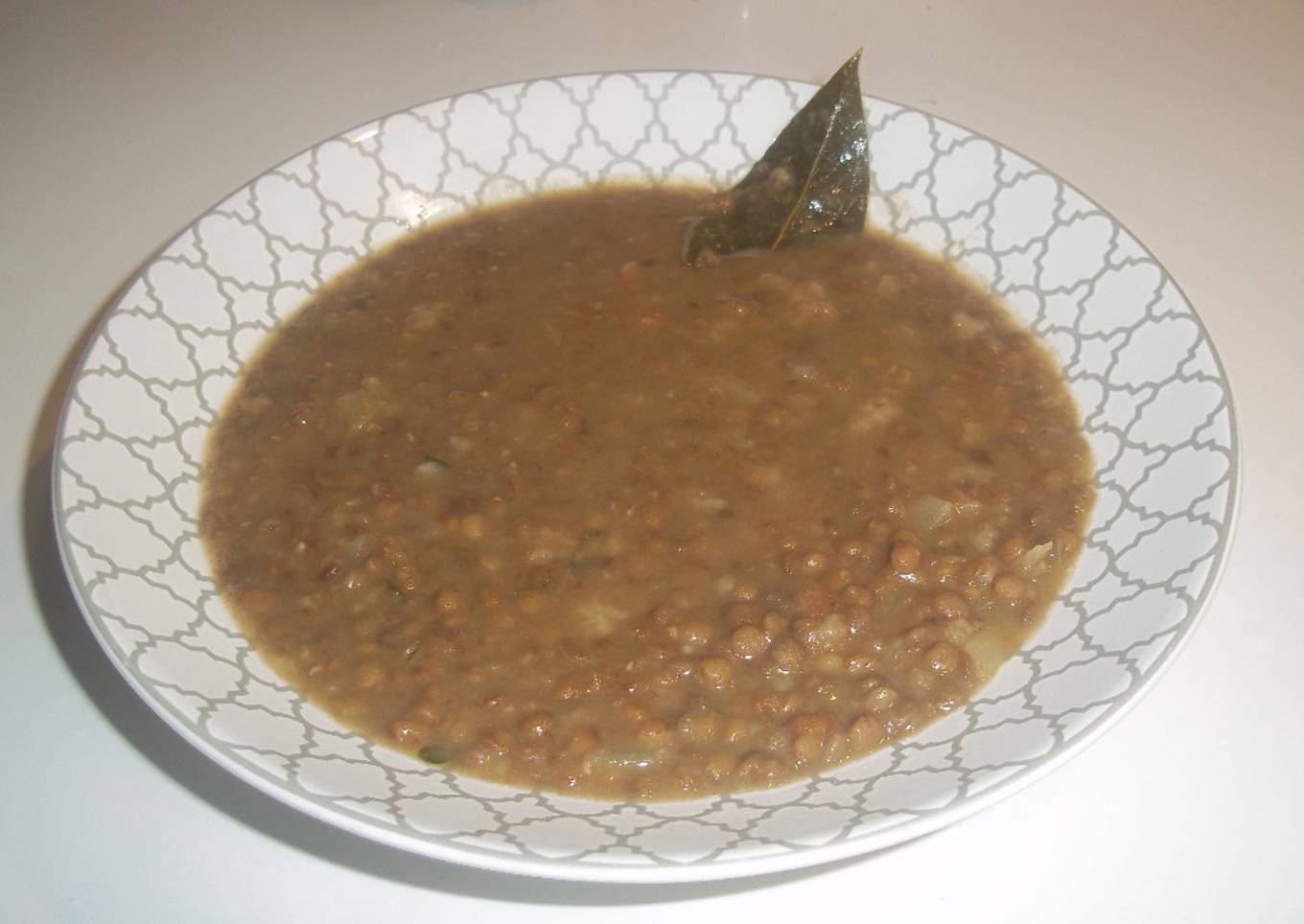 - Lentejas finalizadas. Debes de quitar el ajo sin pelar y la hoja de laurel.