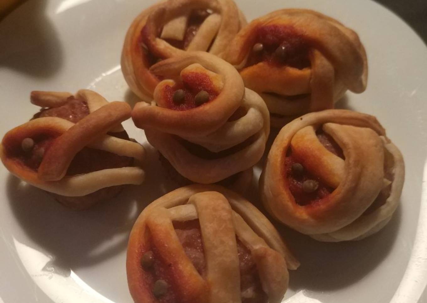 - Hacemos tiras de medio centímetro, aproximadamente, con el hojaldre y envolveremos con cada tira una albóndiga. Dejando un hueco para después colocar los ojos de nuestras cabezas momificadas.