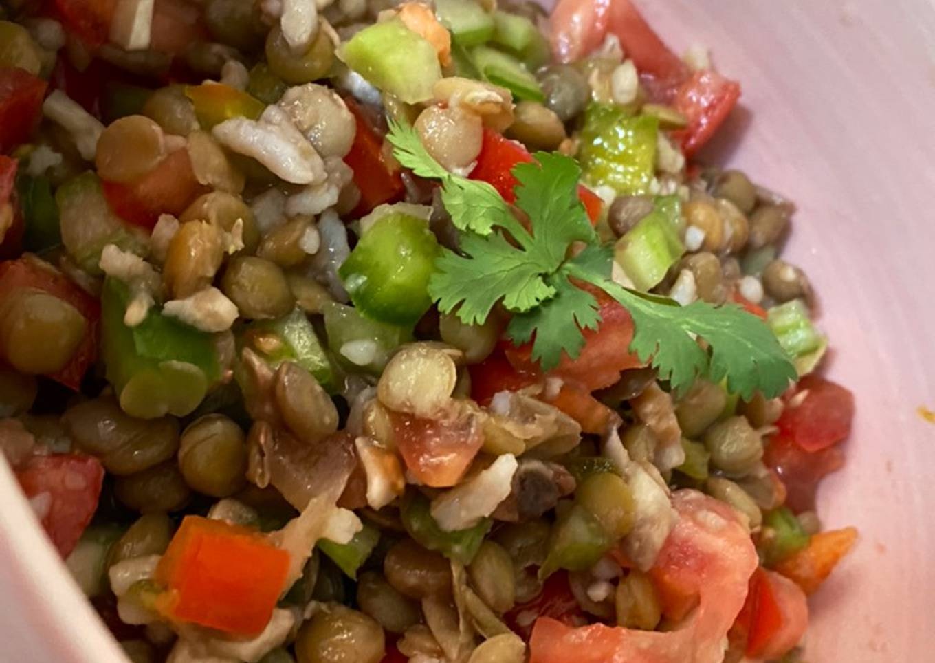 - Ya por último agregar en un bol las lentejas junto con las verduras picadas, añadir los ingredientes líquidos, sal y pimienta a gusto y revolver. Por último puedes adornar tu plato con hojas de perejil o cilantro.