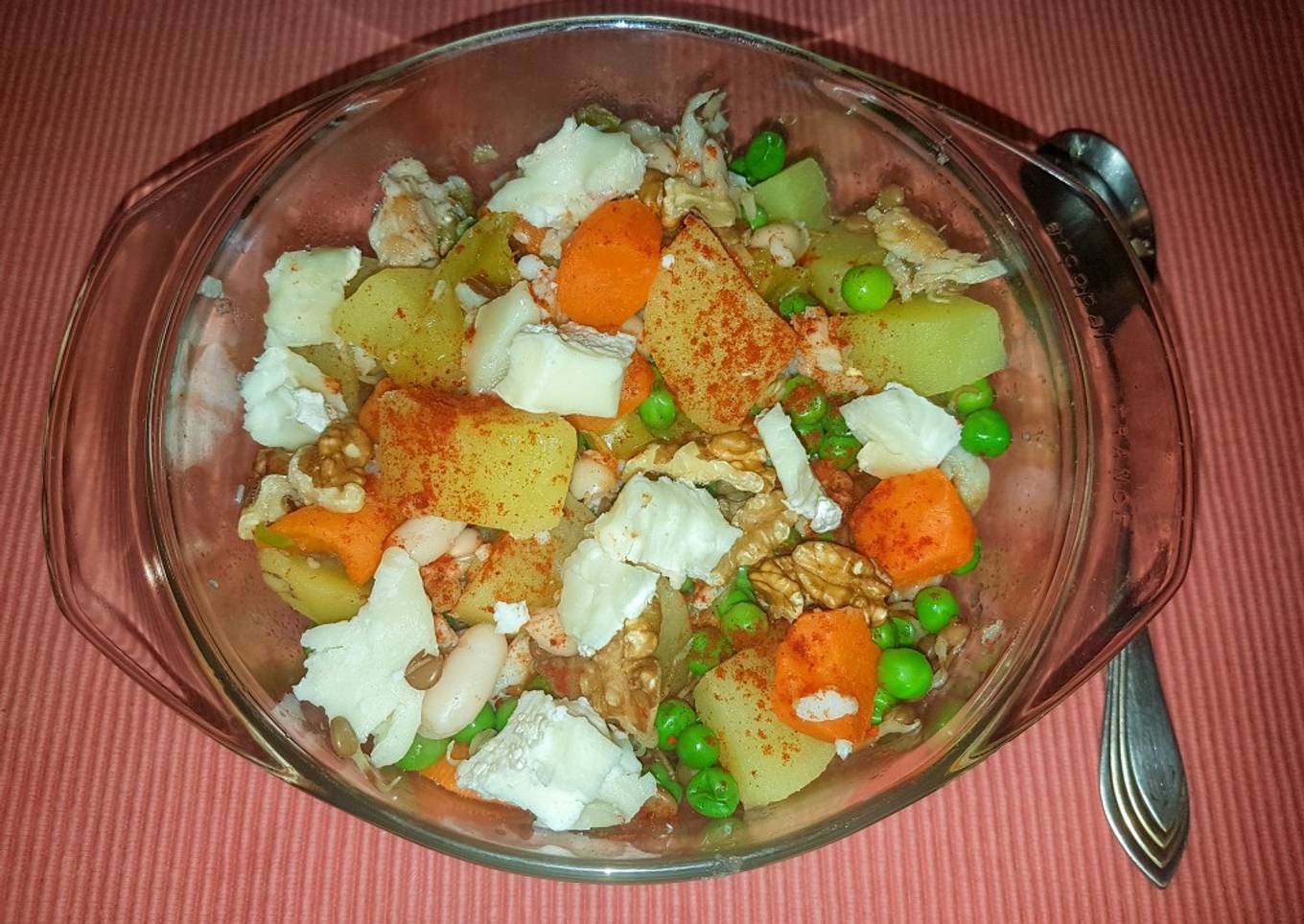 - Le echamos el resto del AOVE, el zumo de lima, cilantro, removemos todo bien y le echamos a continuación el pescado desmenuzado y el resto de la verdura hervida (lo hacemos así para que la verdura en cocción sufra lo menos posible y se nos rompa). Ya solamente queda emplatarla, le agregamos las nueces y un poco queso de cabra, un poco de pimentón picante y listo. Podemos mirar si necesita rectificar la sal, pero como le echamos salsa de soja al pescado no nos haría falta. ¡¡Bon profit!!