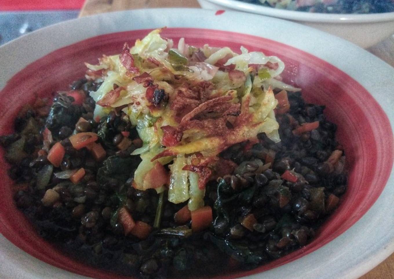 Guiso de lentejas negras con crocante de papas y tocino
