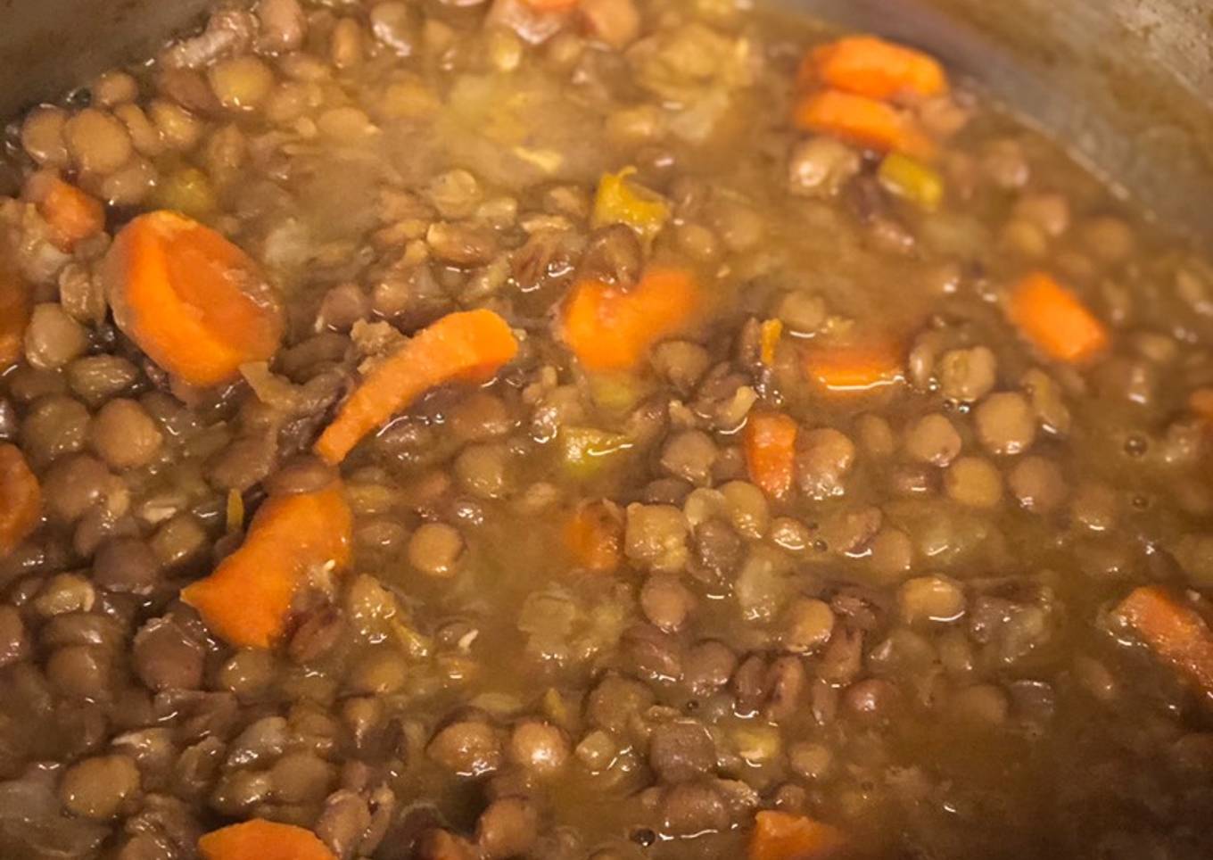 - Echamos el sofrito a la olla de lentejas y dejamos cocer 5 minutos más