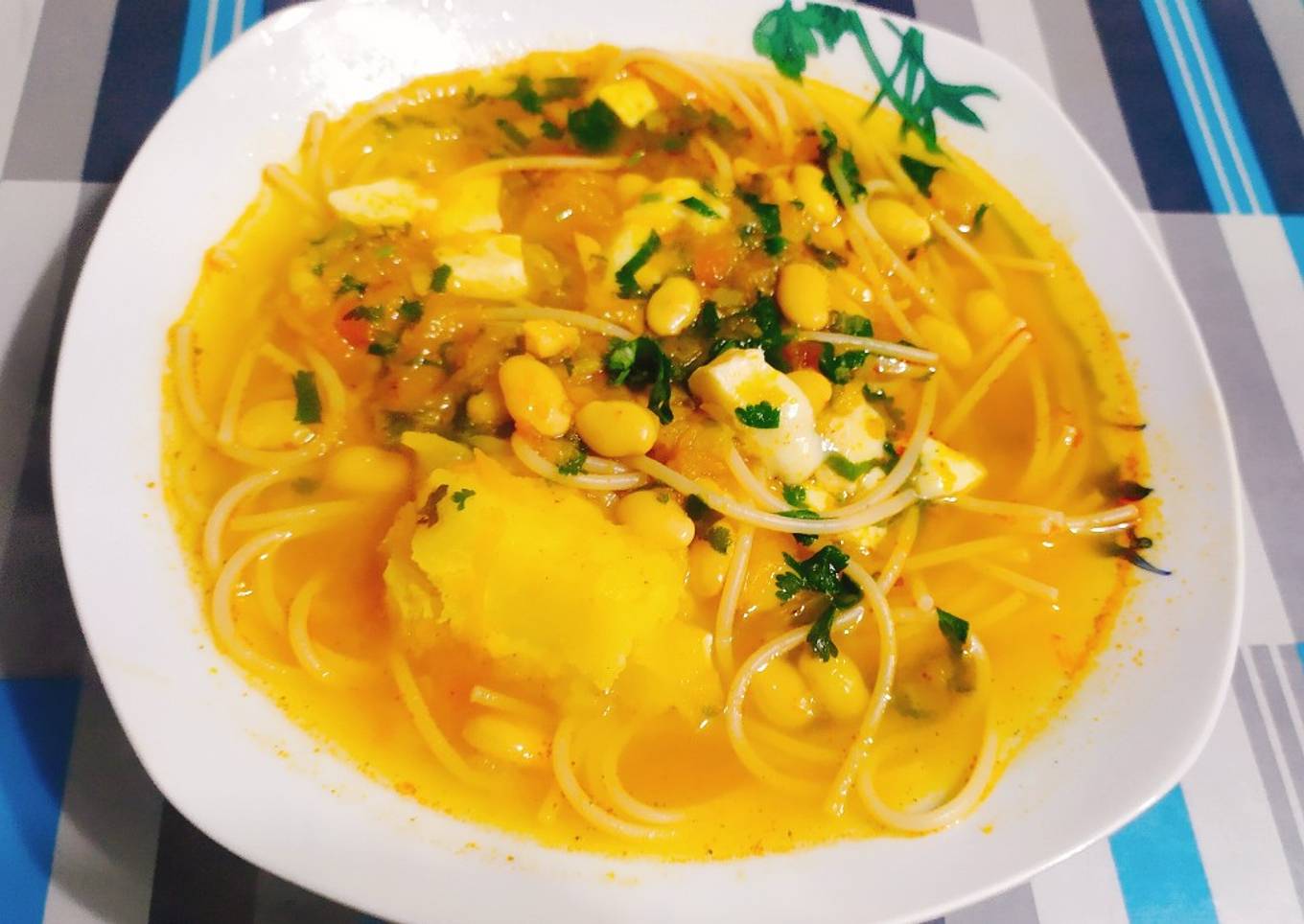 - Después del agua echamos, las lentejas y el zapallo, dejamos cocinar por 25 minutos aproximados, luego incorporamos los fideos y la papa amarilla, cuando estén al dente los fideos, retiramos y agregamos el queso y culantro picado, servimos de inmediato.