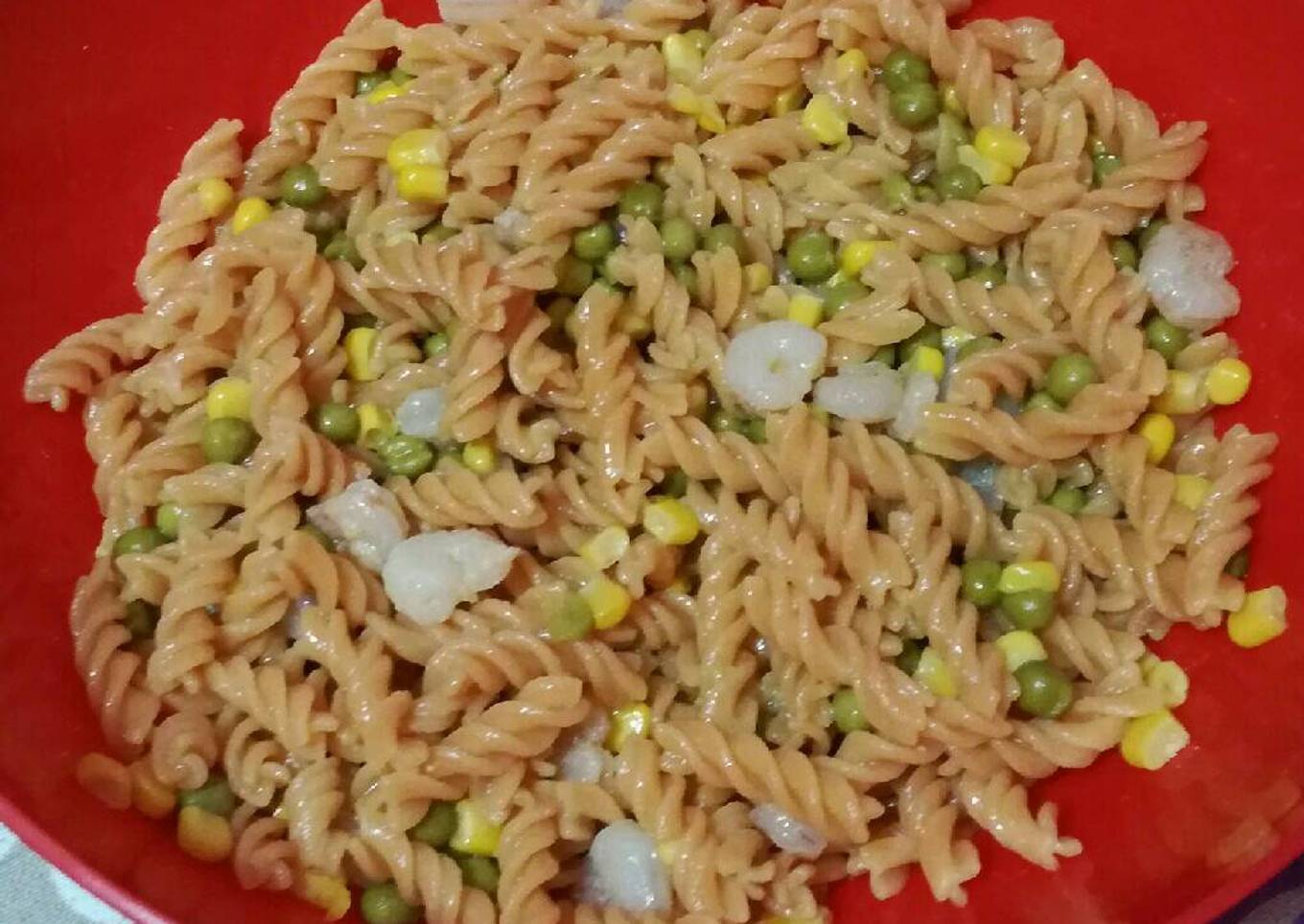 - En un bol añadir los guisantes y maíz previamente lavados y escurridos, incorporar las hélices.