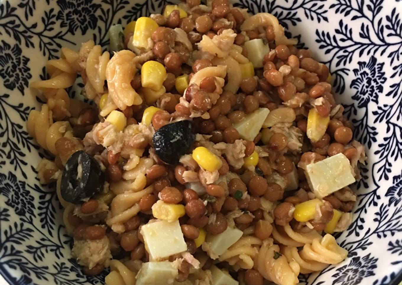 - En un bol añadimos las lentejas lavadas y escurridas y la pasta cocida. Después añadimos los tacos de queso y el atún bien escurrido.