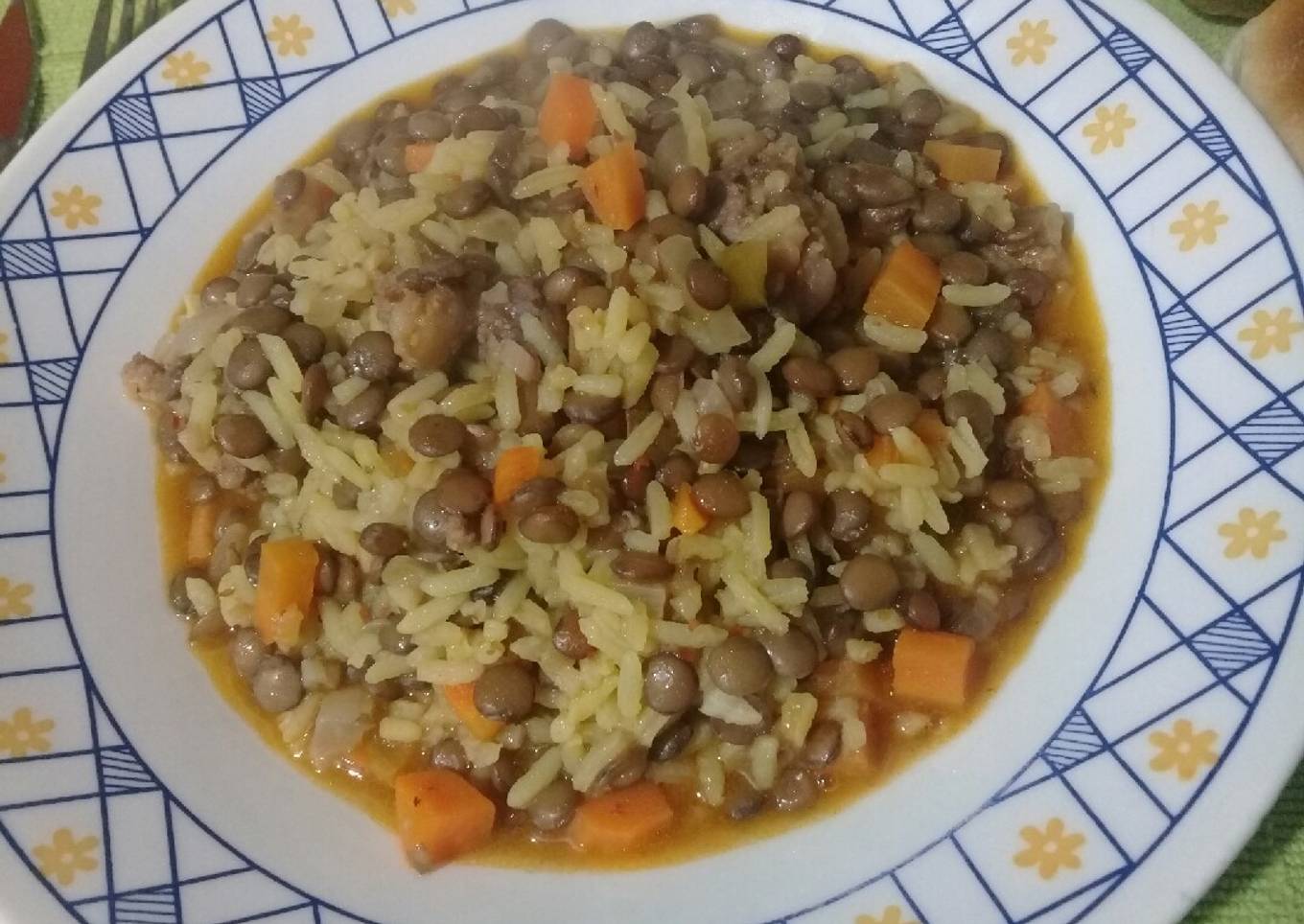 - Agregarle el caldo, los condimentos, el chorizo cortado y media taza de agua. Dejar hervir unos 15 minutos. Y agregarle la taza de arroz ya hervido, la lata de lentejas y media taza de agua. Dejar hervir otros 15 minutos y listo para servir.