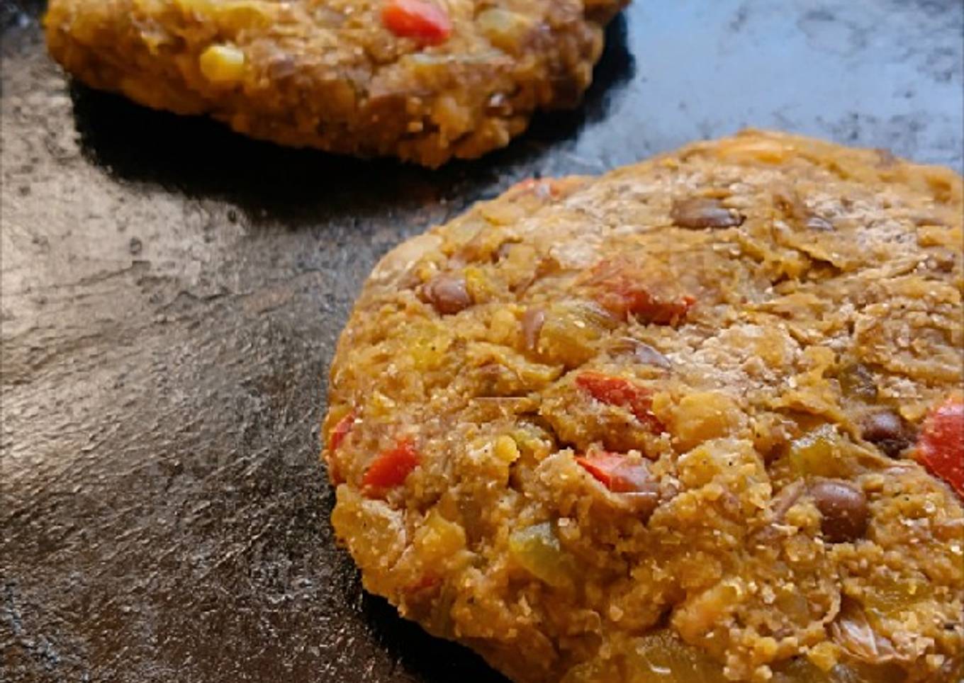 - Una vez todo salteado, condimentamos (yo uso sal, un mix para vegetales cocidos y c煤rcuma), agregamos las verdus a las lentejas/garbanzos y mezclamos, le vertemos harina de garbanzos y arroz hasta poder armar una mezcla que se pueda manipular con la mano y armamos las hamburguesas