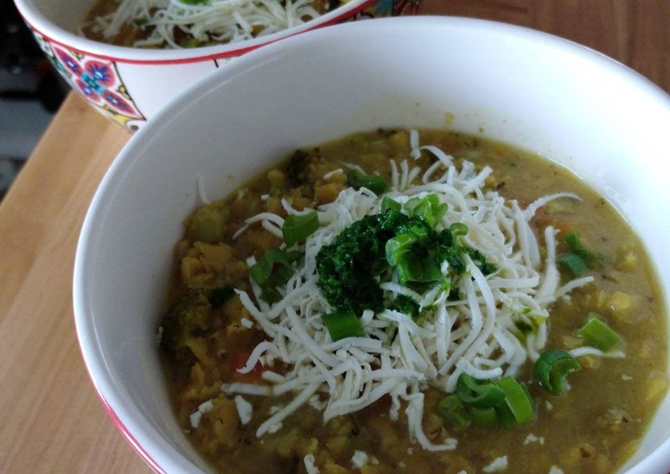 - Picar el cebollín, el jengibre y el ajo y sofreír en una olla con una cucharada de aceite de oliva. Agregar la salsa de soja, el curry, el caldo, sal y pimienta a gusto e incorporar el agua caliente. Añadir las lentejas y hervir por 10 min. Agregar el brócoli picado y hervir por 10 min más.