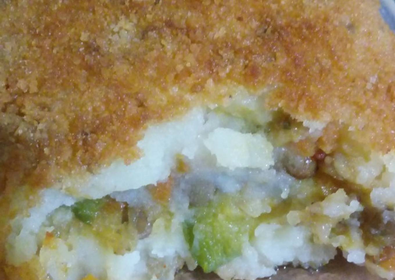 - Con una cuchara agarrar puré de papas y aplastar en tu mano, agregar una cucharada de relleno y formar una bola.