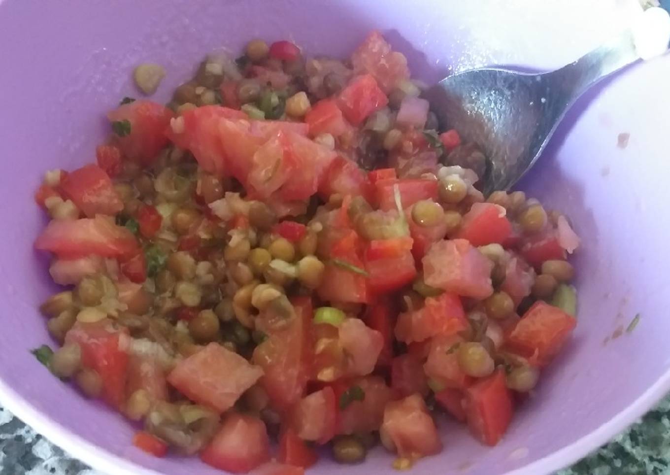 - Lavamos las verduras, las cortamos bien en chiquitito, abrimos la lata de lentejas y las lavamos, escurrimos y colocamos en un bowl todo junto, condimentamos y listo para comer ! Una ensalada fresquita, de verano y que podes acompañar varias comidas... se puede hacer sin Morrón colorado para que no quede tan fuerte. Y las lentejas se puede hacer con las compradas en paquete que hay que hervirlas...