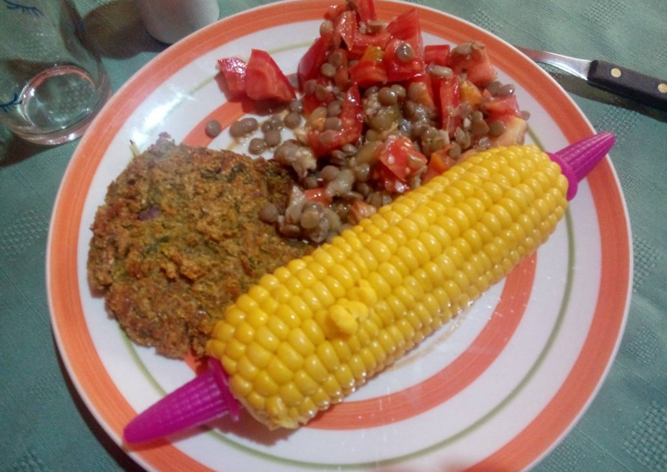 - Yo la acompañe con una ensalada de tomate lentejas y berenjenas en escabeche y un choclo