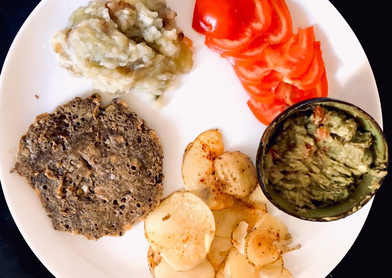 Yo elegí acompañarla con puré de berenjenas y papa, papas al horno, guacamole y tomate, pero podes armar la guarnición que más te guste!