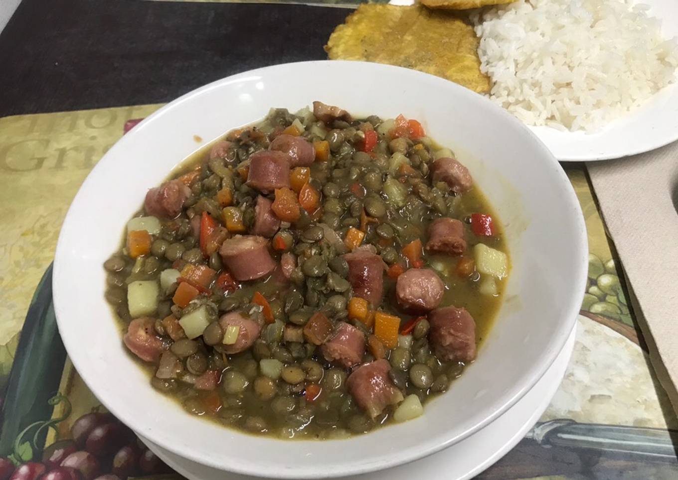 - Agregar las carnes a las lentejas, dejar al fuego por 10 minutos más. Servir con arroz blanco y patacón.