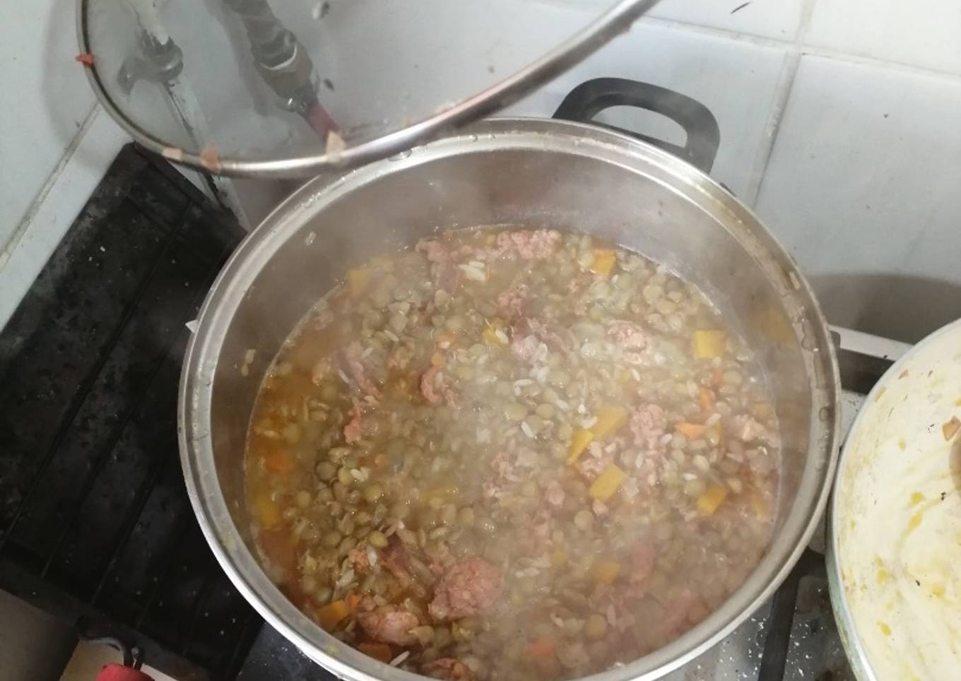 - Finalmente echar el arroz a la olla de las lentejas y tambier vaciar el sartén en la olla. Mezclar todo y echar sal a gusto