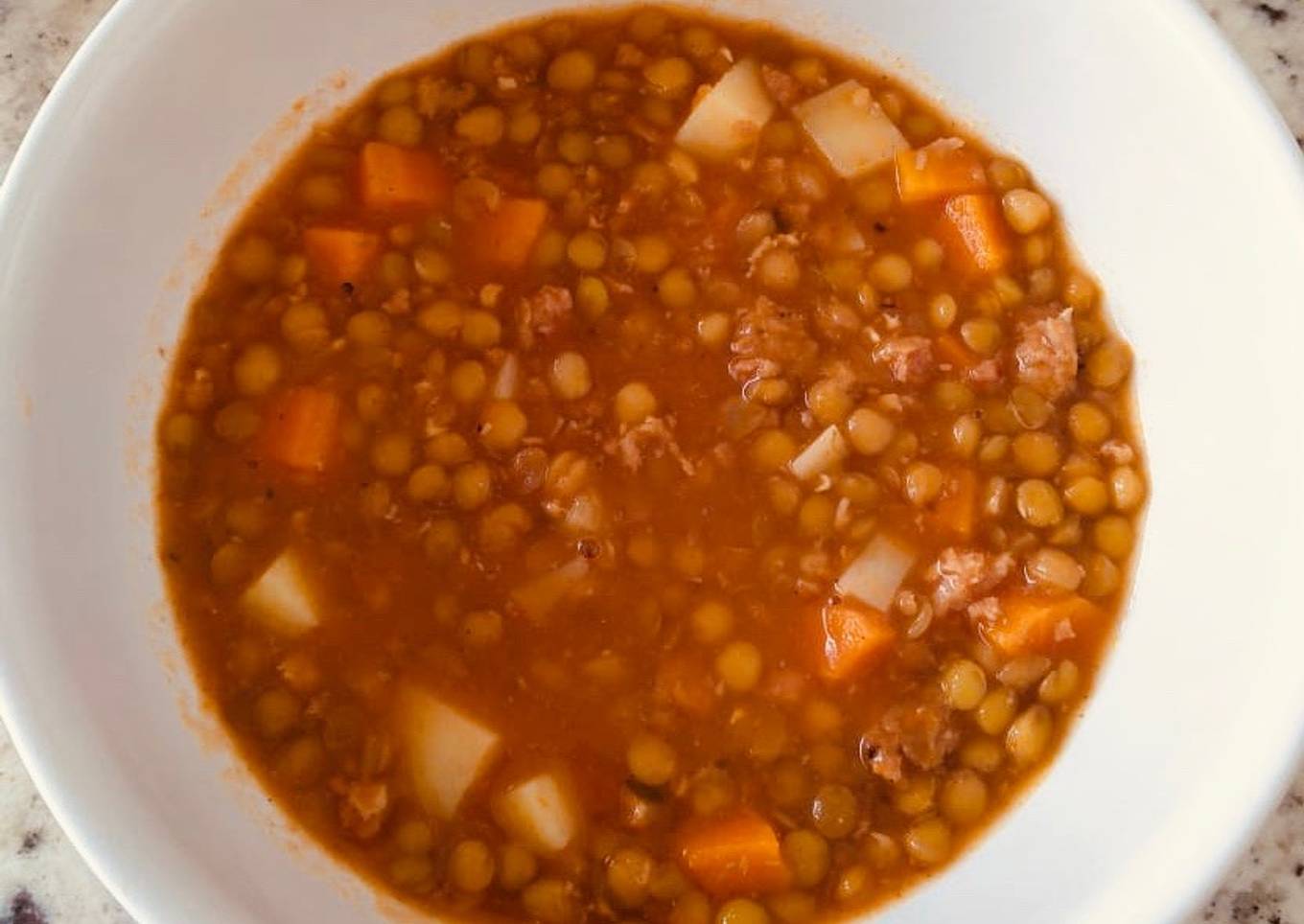 Hice una variación de las lentejas que normalmente hago que llevan tocino, solo tenía longaniza; tomaron un sabor delicioso.