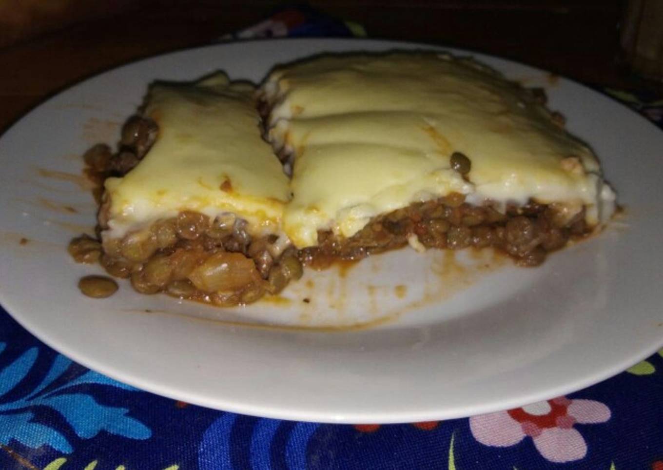 - En una fuente de vidrio o la que tengan, colocamos todo el relleno de lentejas, aplanamos con ayuda de una cuchara, por arriba vertemos la salsa blanca, acomodamos bien para que llegue a todos lados, llevamos a un horno 200° por 20', pueden agregarle queso magro arriba queda muy bueno. Espero que les guste!!